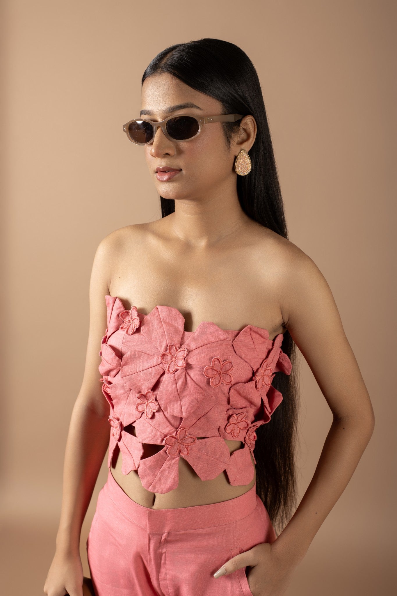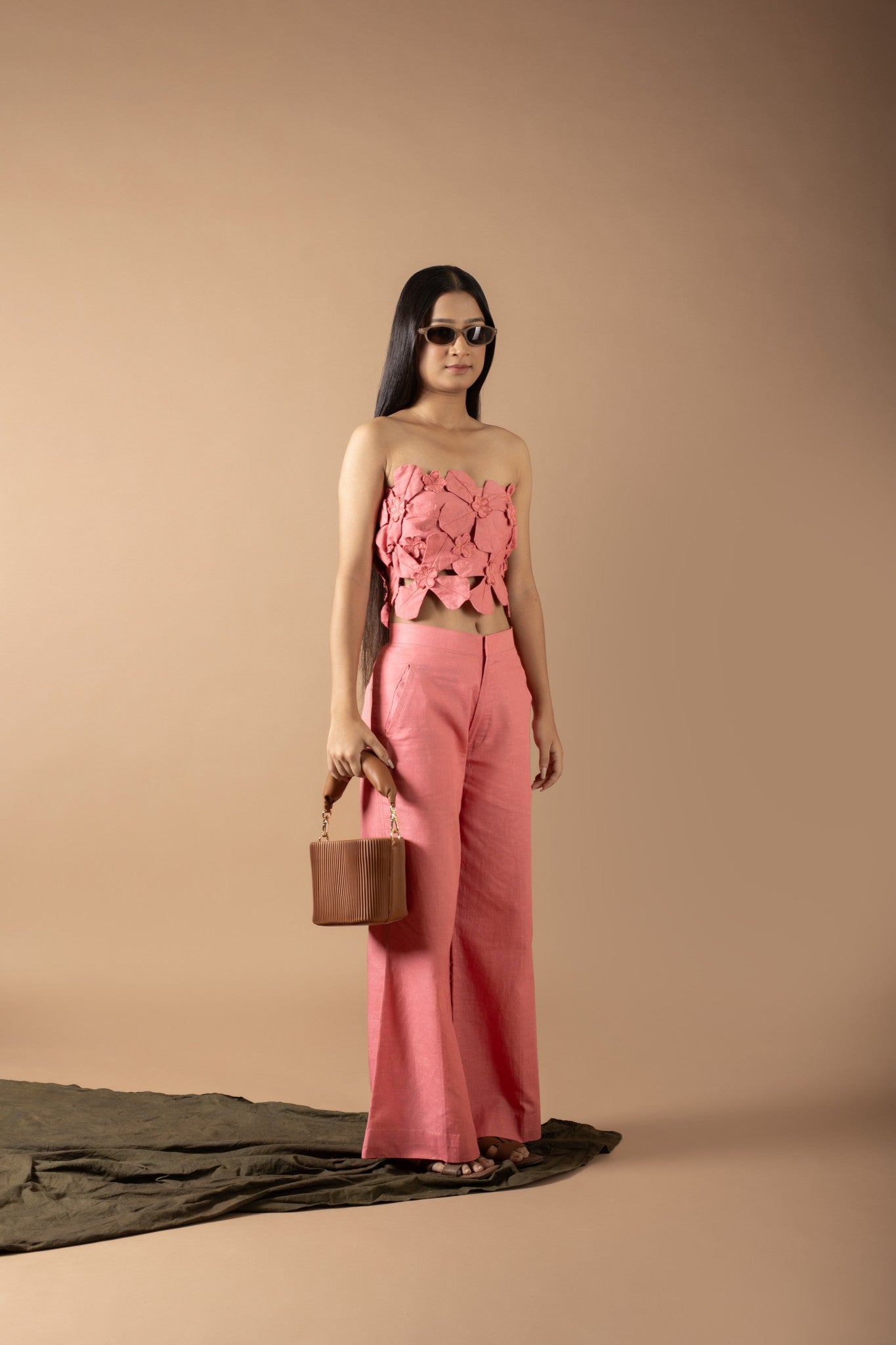 Introducing Alexandra pink embroidered tube top and pants set. The top has flower cut out details arranged in overlapping appliques giving it a playful 3d effect, with high waisted wide leg pants that complements the relaxed yet stylish feel.