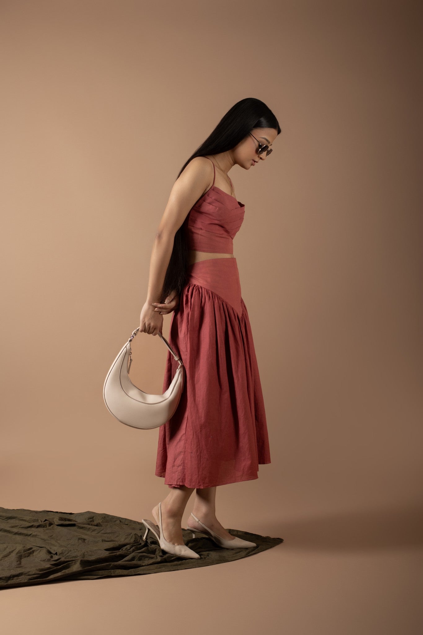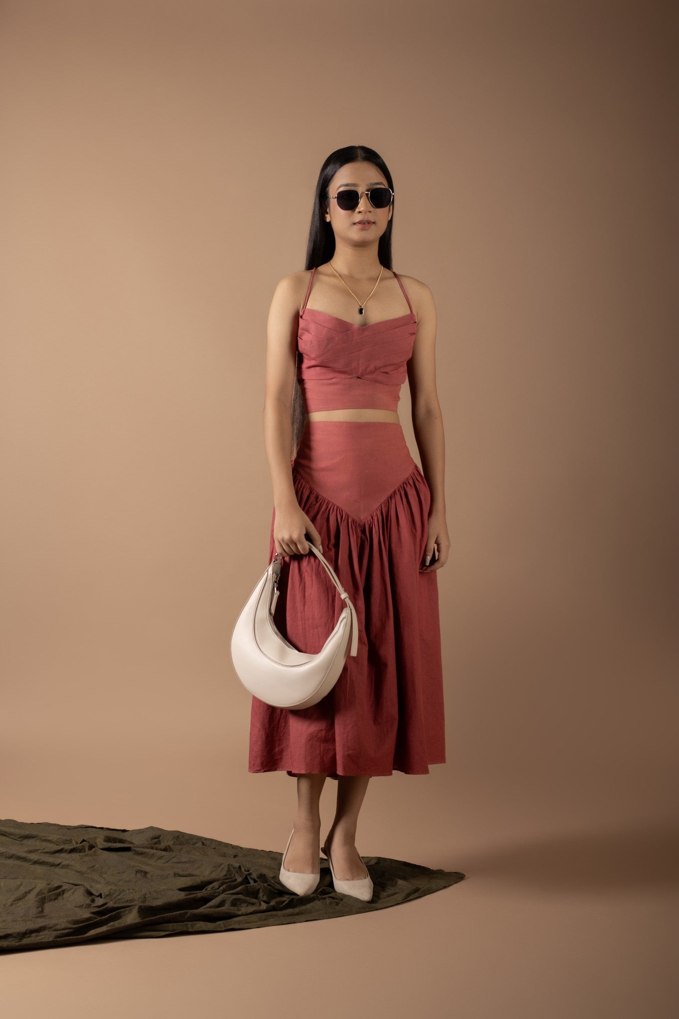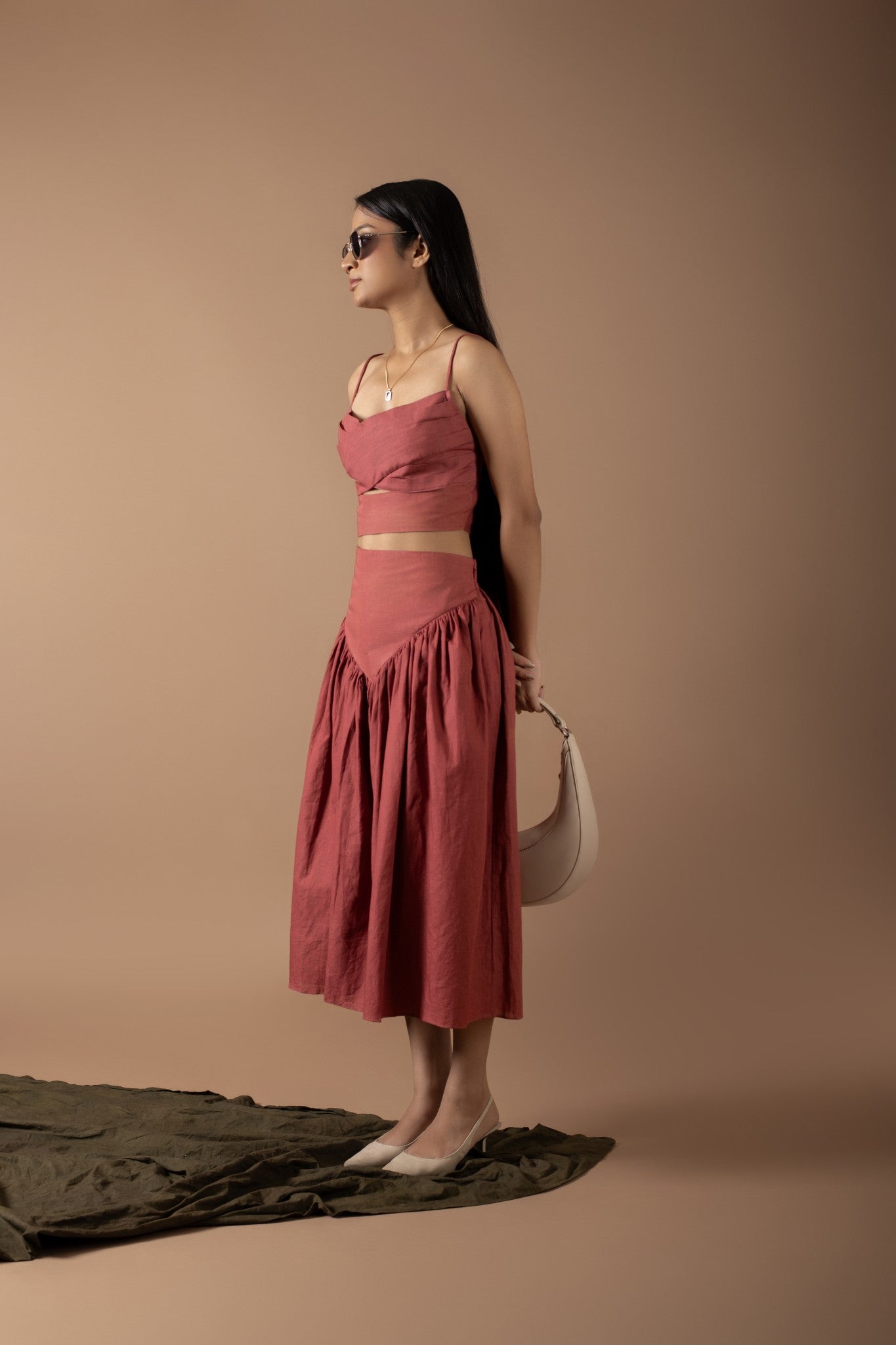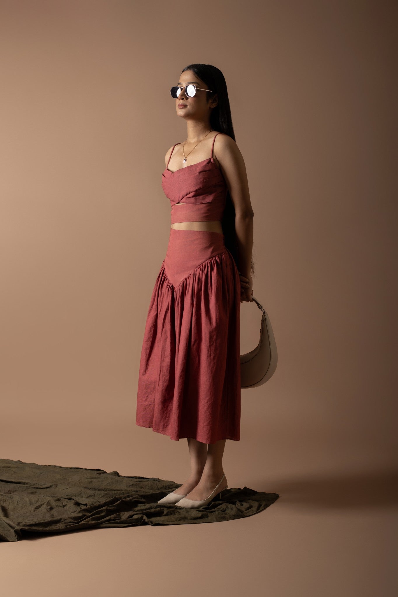 Introducing a fitted crop top with muted rusted hue, featuring a sweetheart neckline and delicate spaghetti straps giving it a very summery and feminine look, with a matching high waisted midi skirt with dropped yolk and gathered panels that create subtle volume and movement white maintaining a streamlined silhouette.