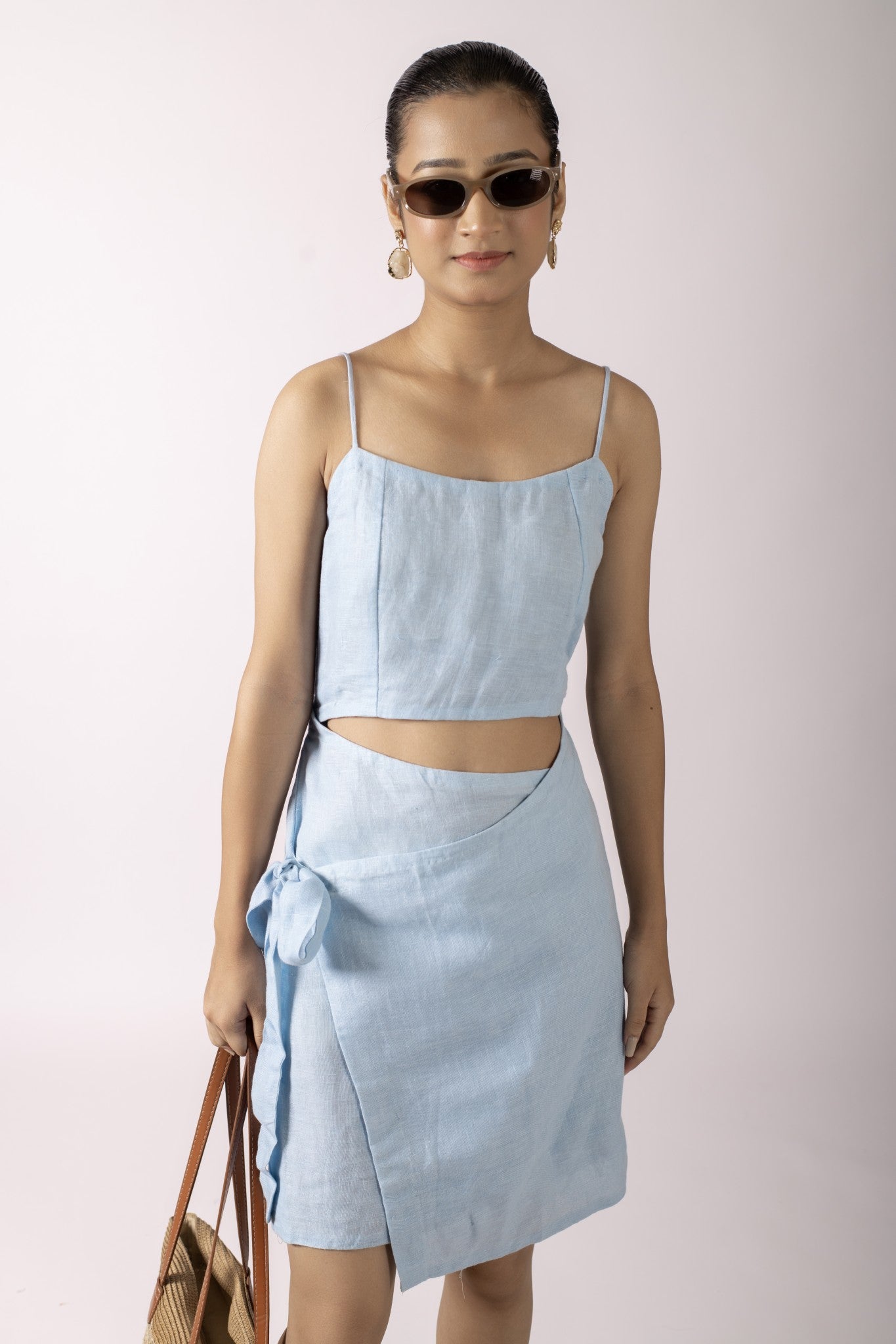 Introducing a fitted, sky blue linen wrap around short dress with thin spaghetti straps giving a minimalist and airy feel with smocking details on the back for better fits. Effortless vacation elegance.