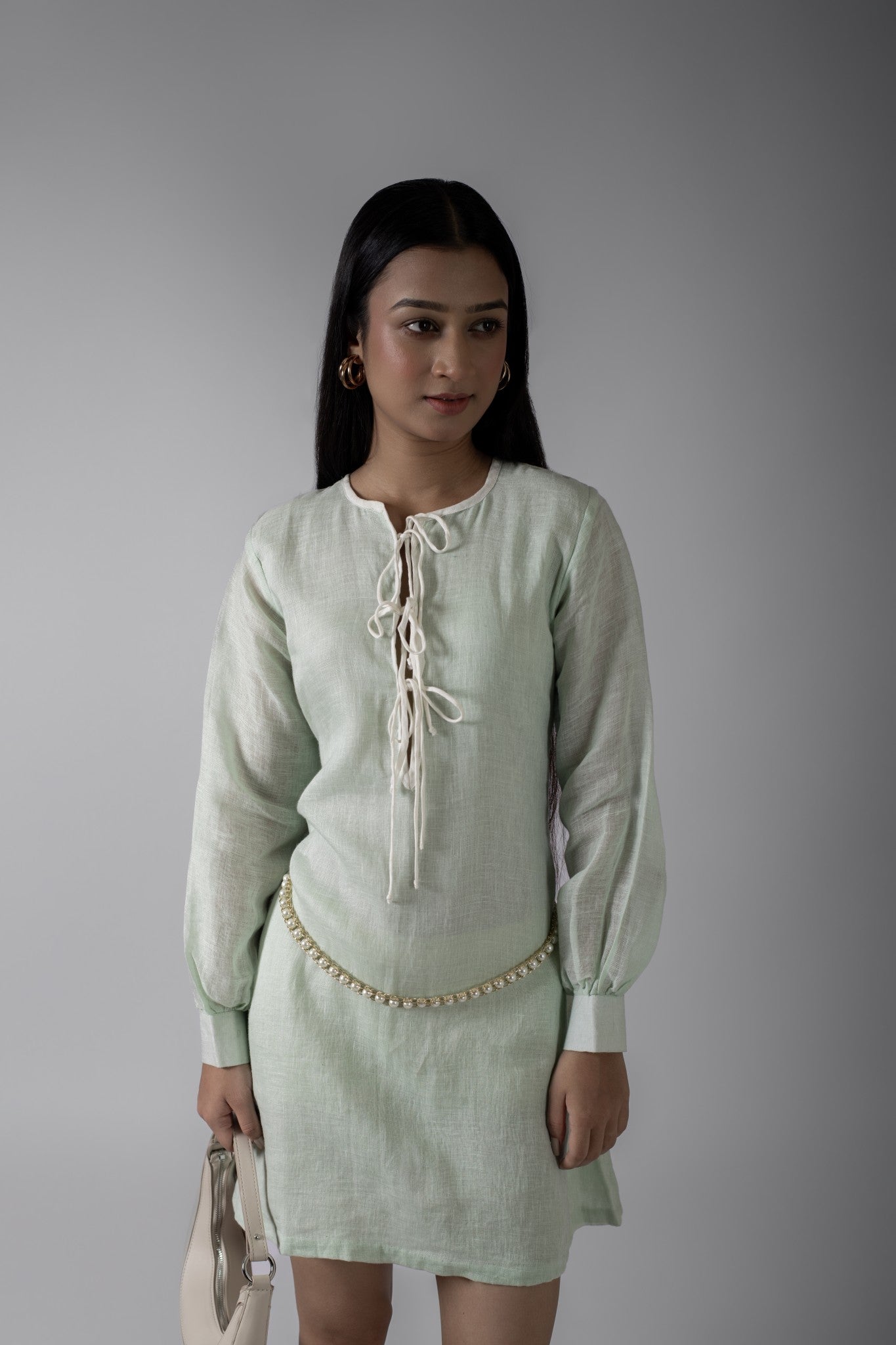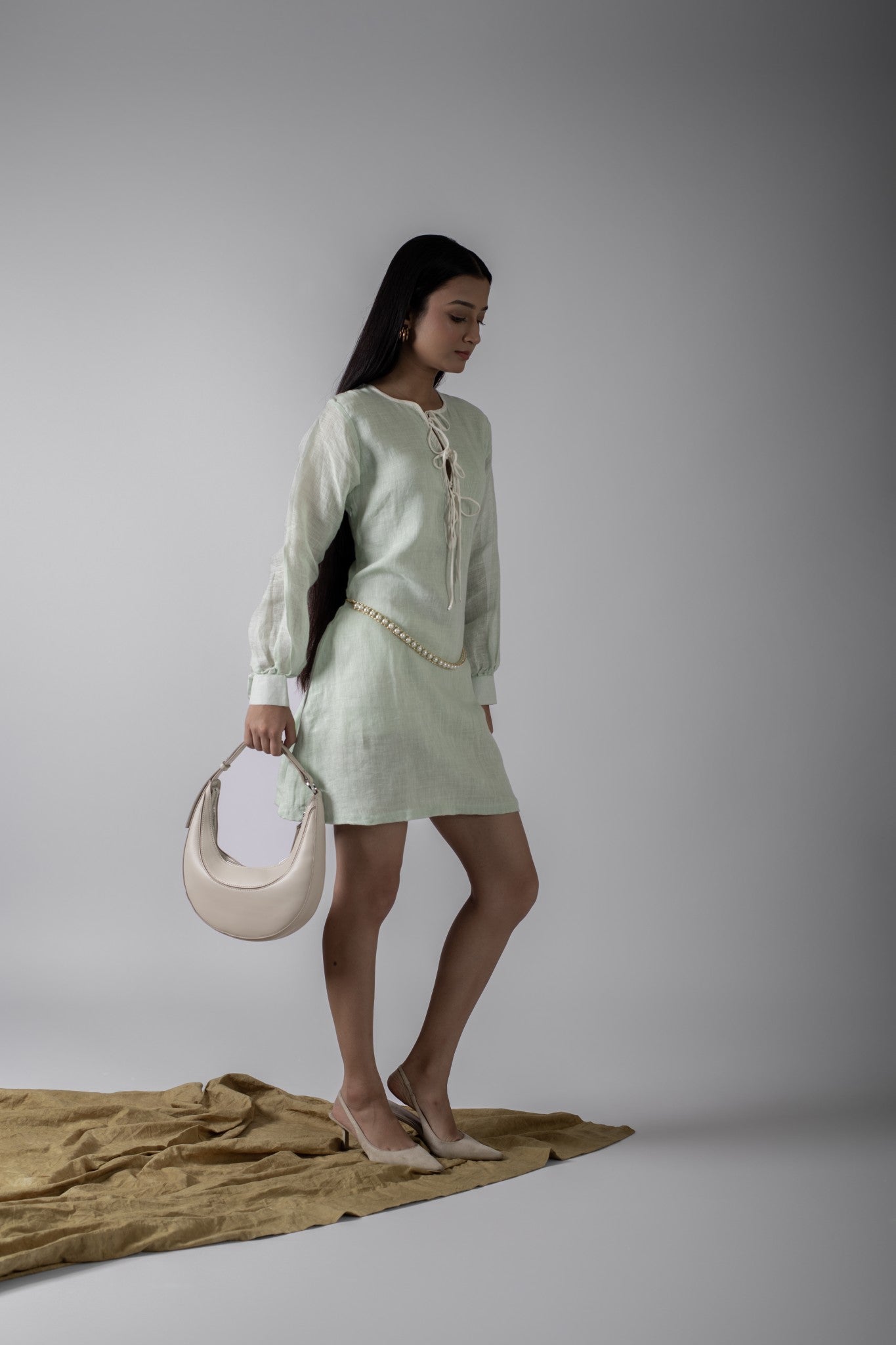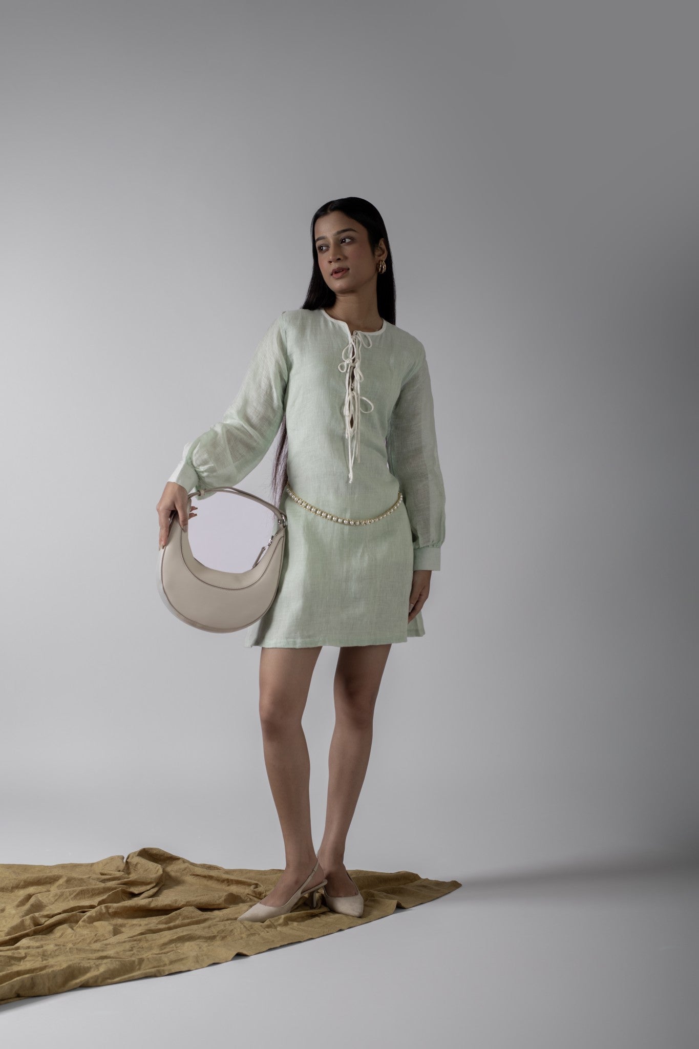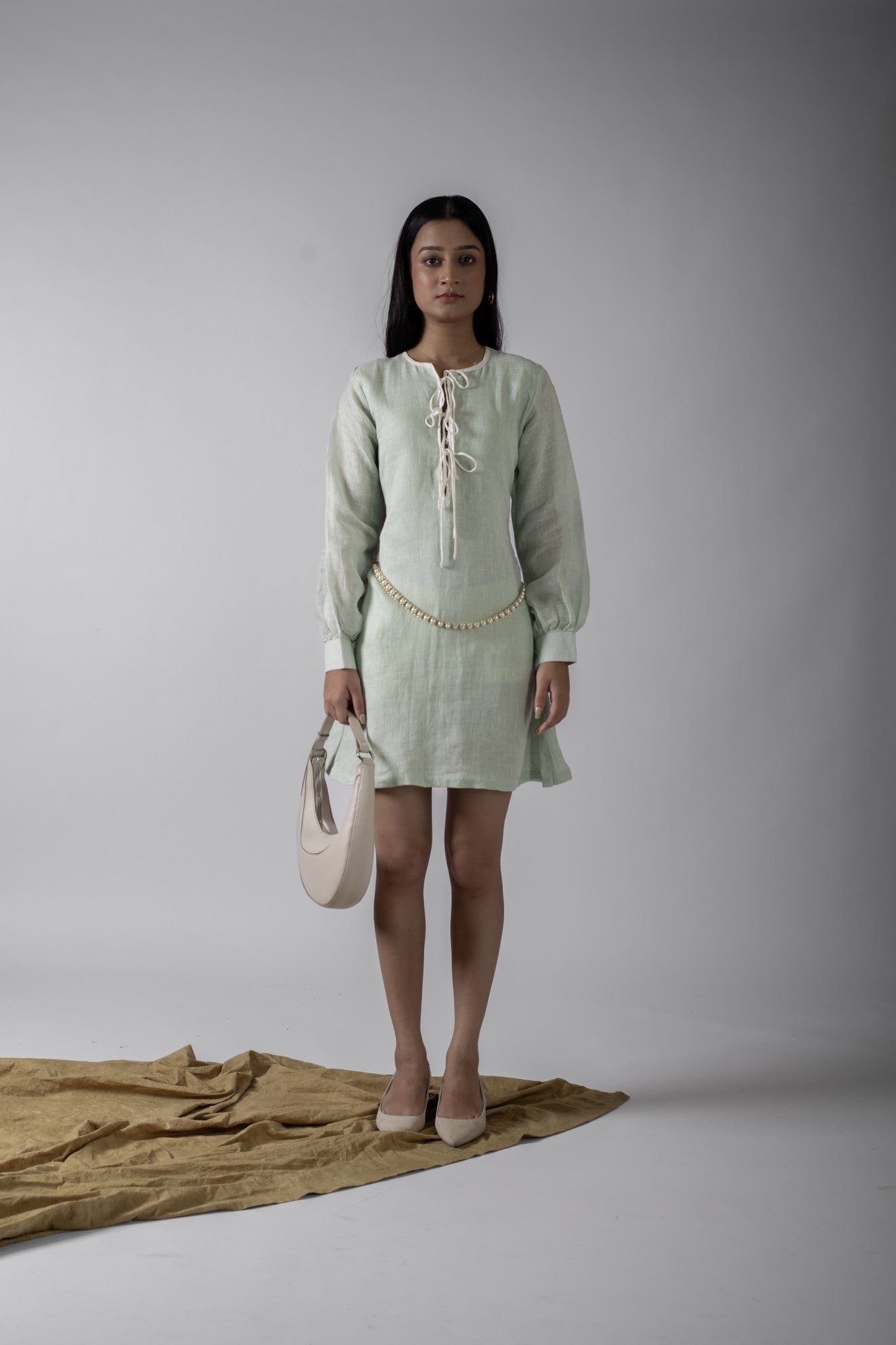 Introducing this linen mint green short dress which is breezy and effortlessly stylish, this mini dress is crafted from a soft linen blend in a refreshing mint green tone. Featuring a lace-up neckline with contrast tie detail, long balloon sleeves with fitted cuffs, and a relaxed A-line silhouette, it’s the perfect blend of casual and chic. Pair with flats for daytime ease or dress it up with heels for evening charm.