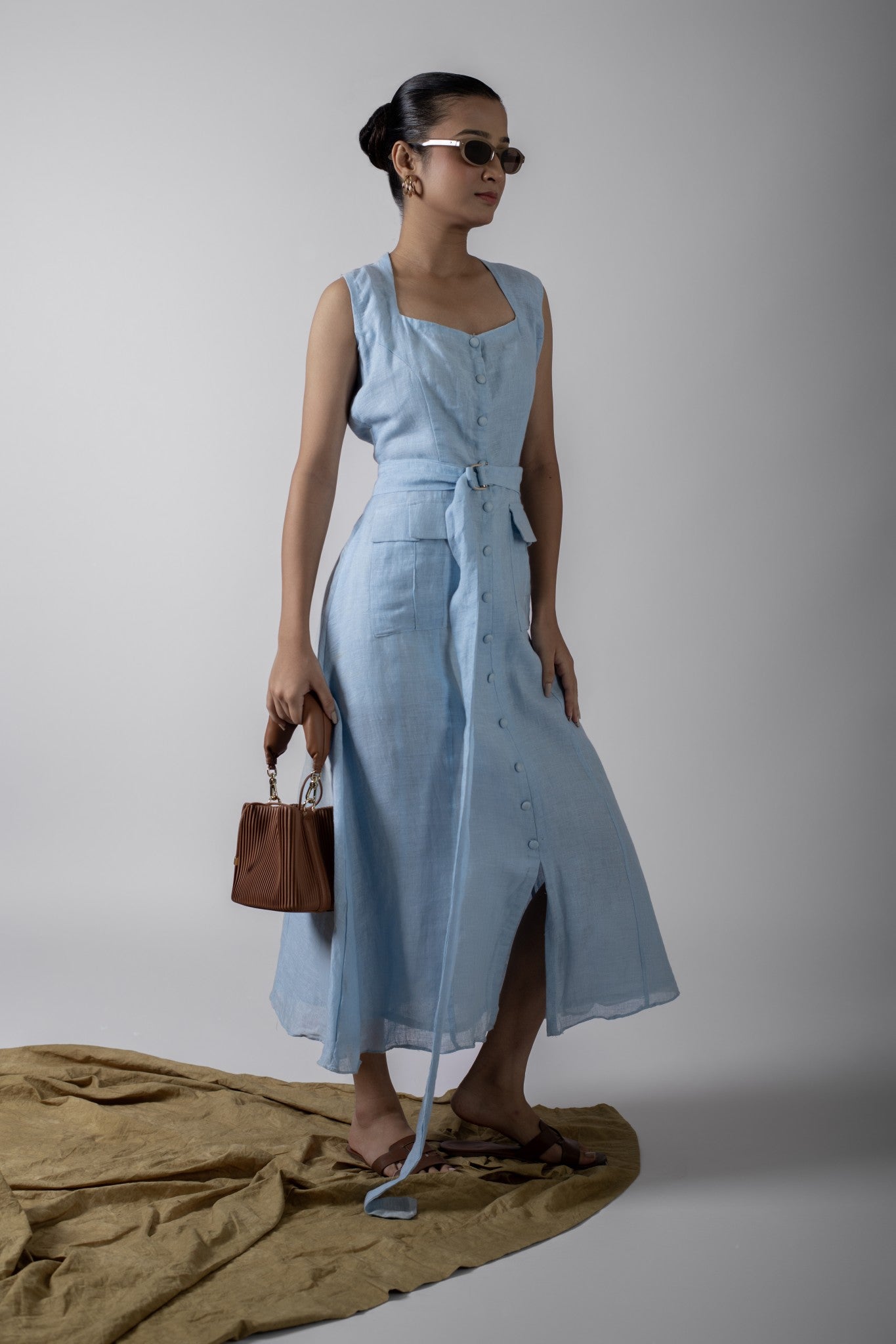 Effortlessly chic and perfect for warm days, this sleeveless midi dress features a flattering square neckline, front button-down closure, and a matching fabric belt to cinch the waist. Designed with functional flap pockets and a front slit for ease, it’s both stylish and practical. Pair with flats for a relaxed day out or dress it up with heels for an evening look.